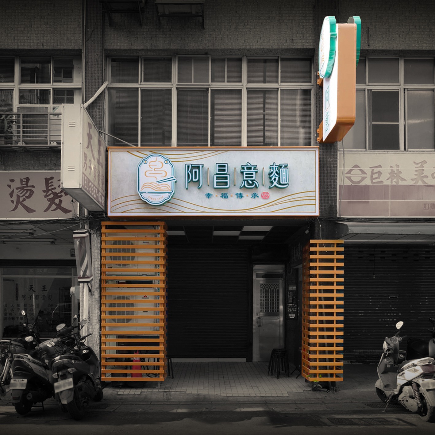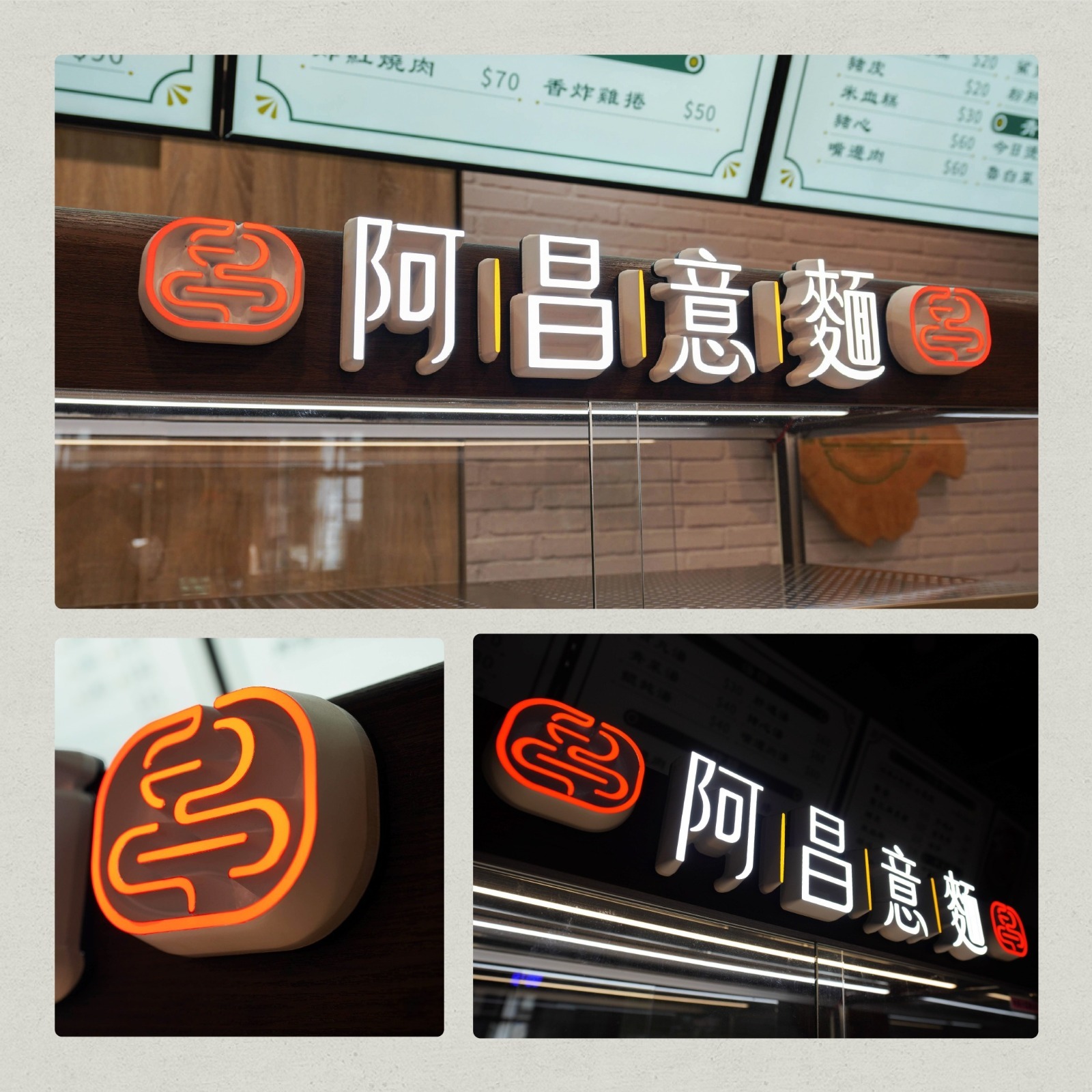 熾橘設計為阿昌意麵打造了一系列專業設計與改造方案,涵蓋品牌LOGO識別設計、戶外廣告招牌設計、門面與入口規劃、室內設計、用餐動線與座位區域配置、櫃檯視覺包裝設計、形象牆設計、抬頭價目表設計、小型定制室內廣告物、產品攝影、點餐菜單設計等多個層面。