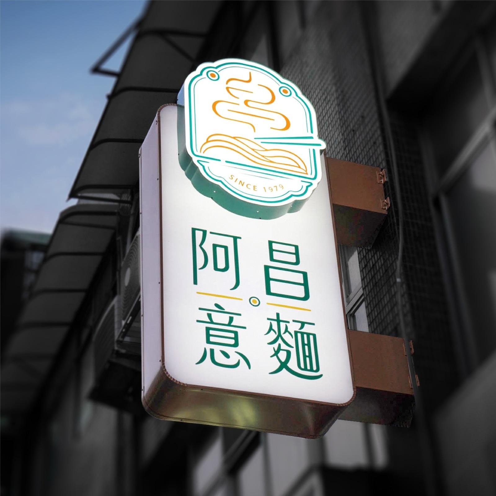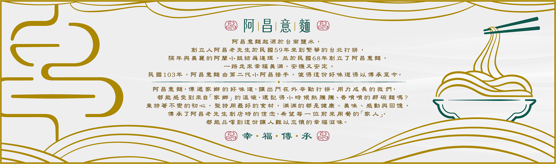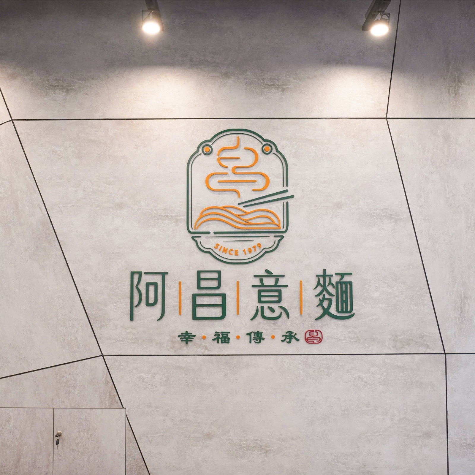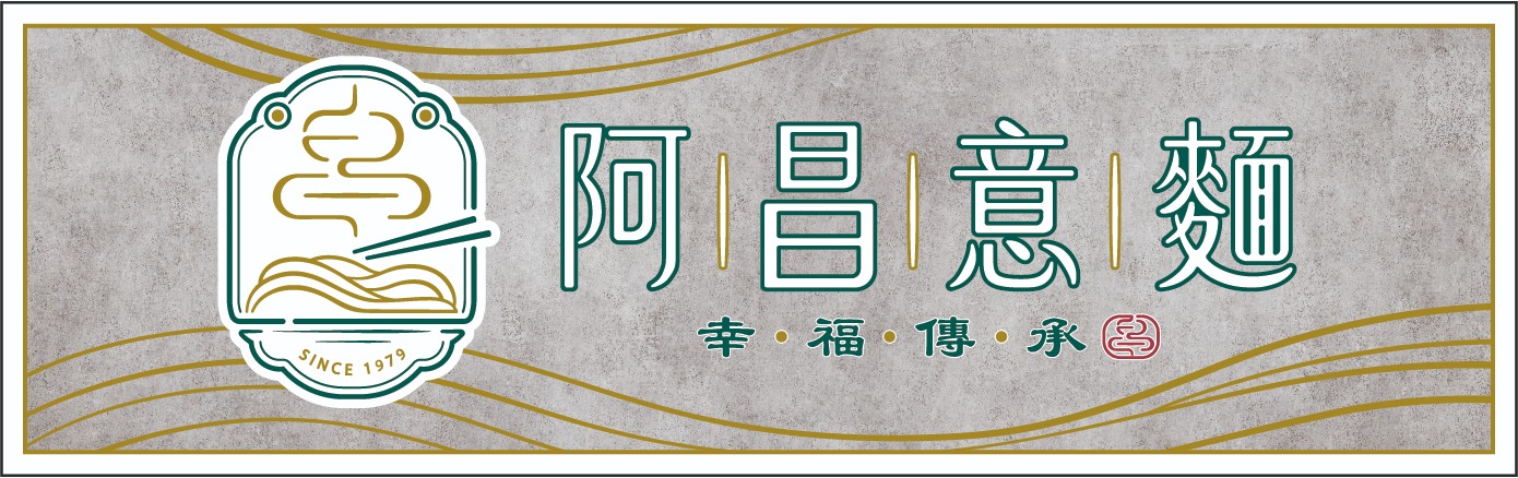 阿昌意麵為二代傳承之品牌,其LOGO設計以麵條散發「熱騰騰煙霧」的意象為核心,象徵麵食的美味與溫暖,同時延展出「香火延續」的深層涵義。搭配副標語「幸福傳承」,進一步強化品牌的傳承故事性與文化深度。