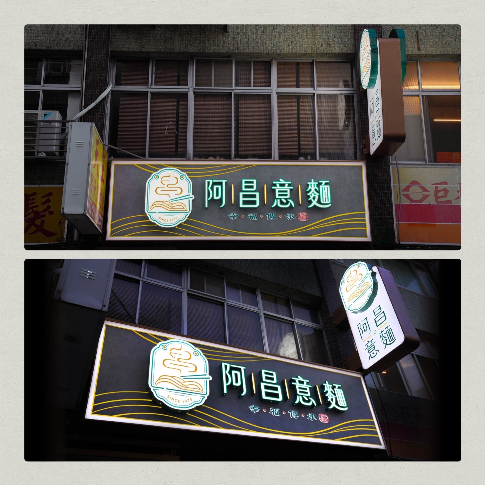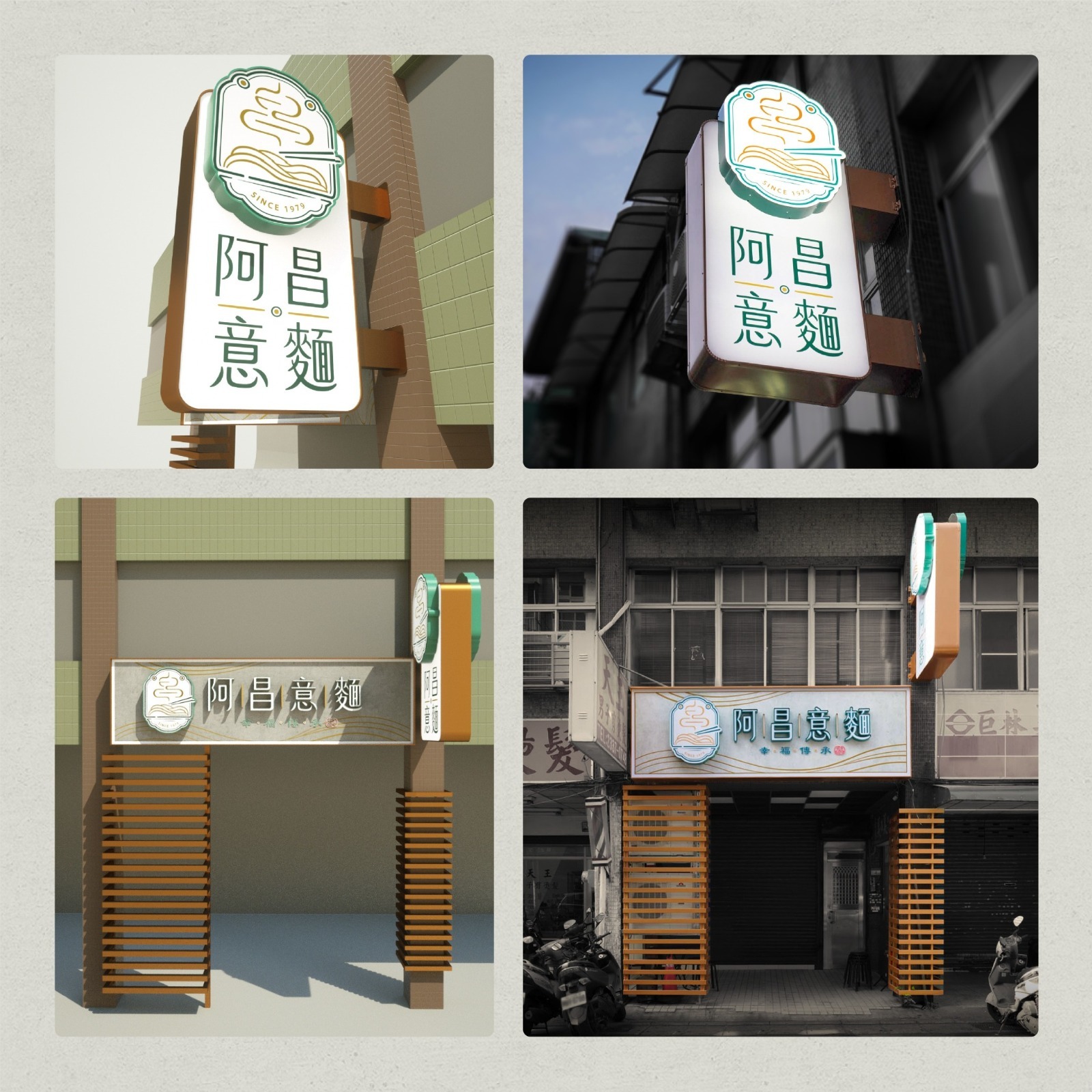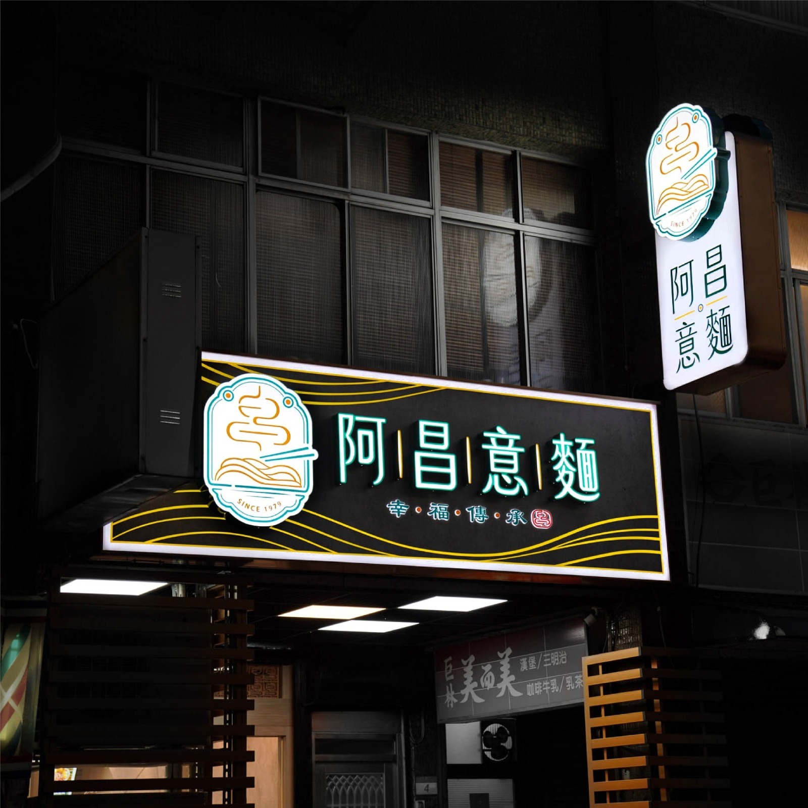 阿昌意麵為二代傳承之品牌,其LOGO設計以麵條散發「熱騰騰煙霧」的意象為核心,象徵麵食的美味與溫暖,同時延展出「香火延續」的深層涵義。搭配副標語「幸福傳承」,進一步強化品牌的傳承故事性與文化深度。