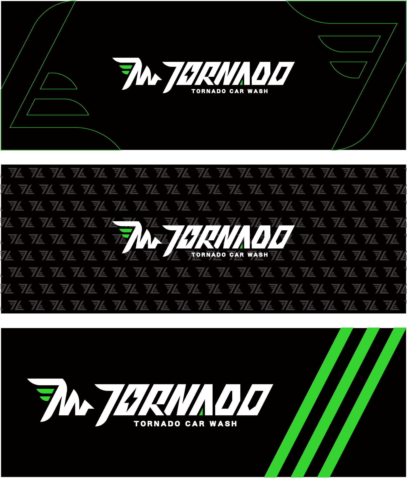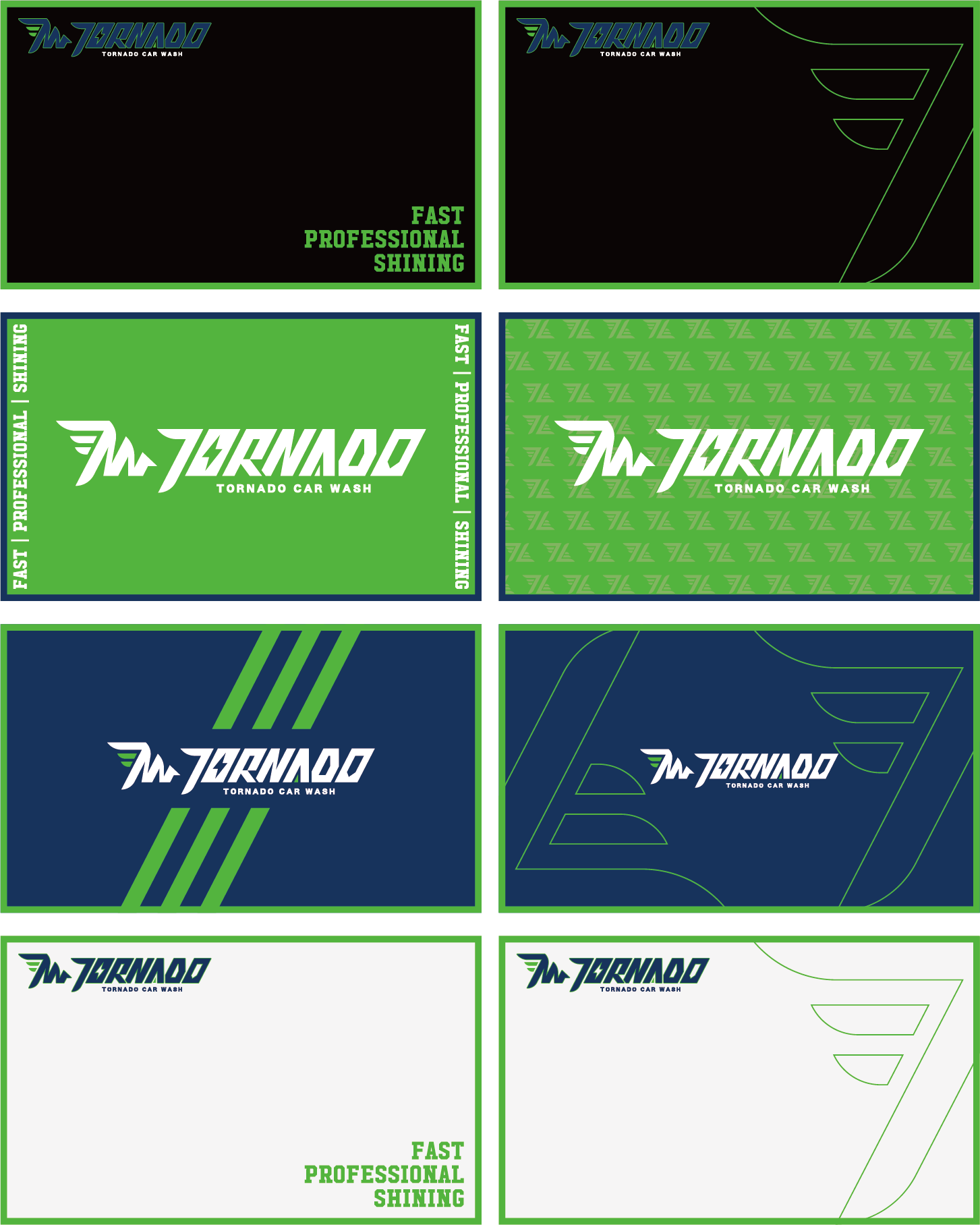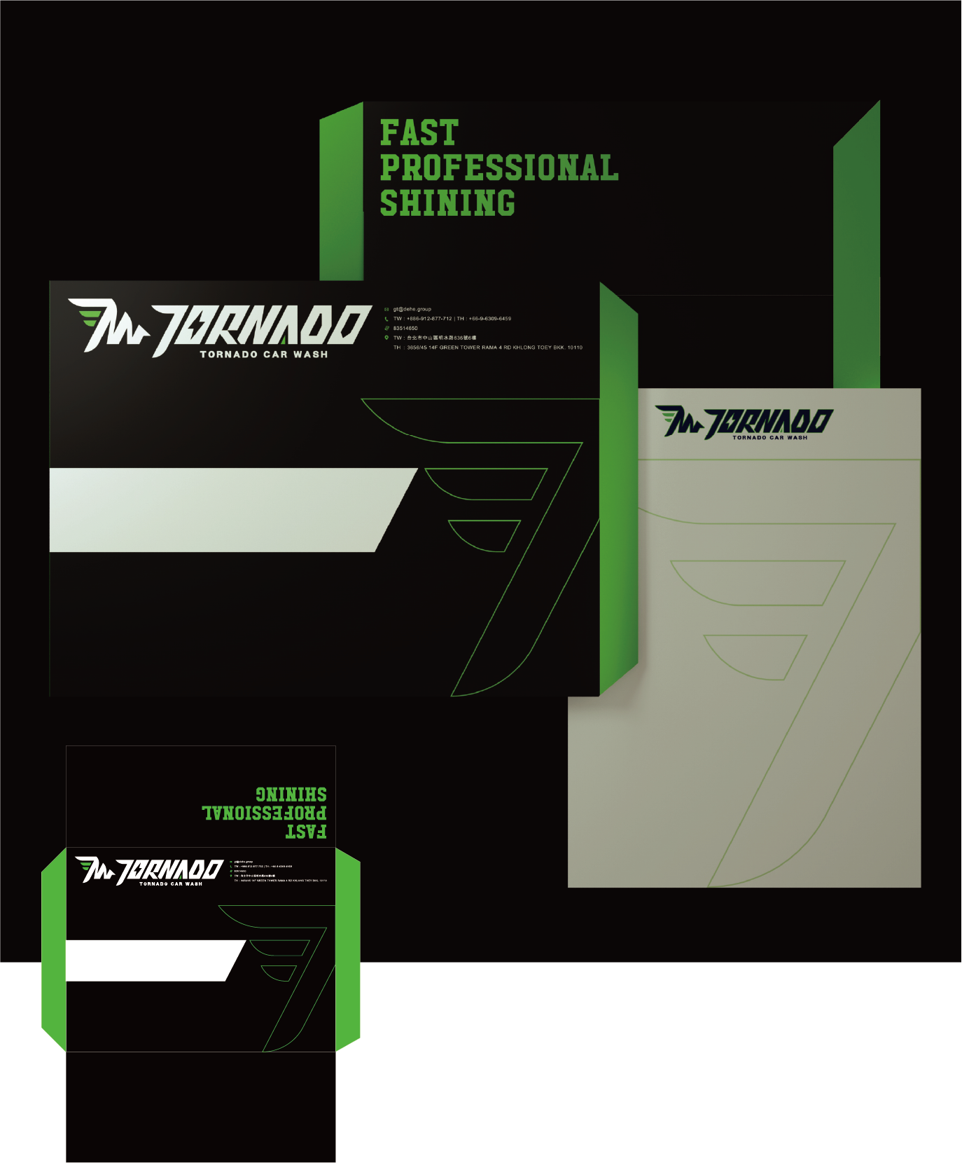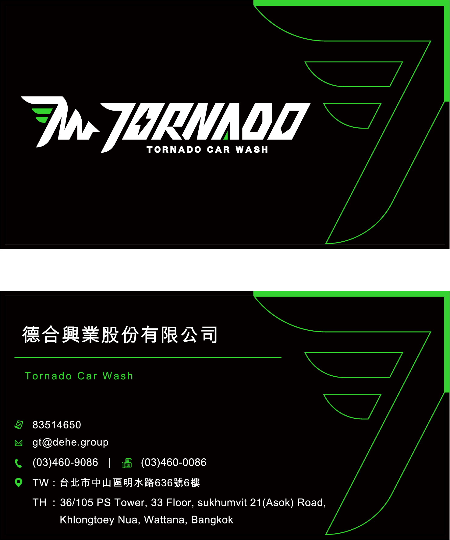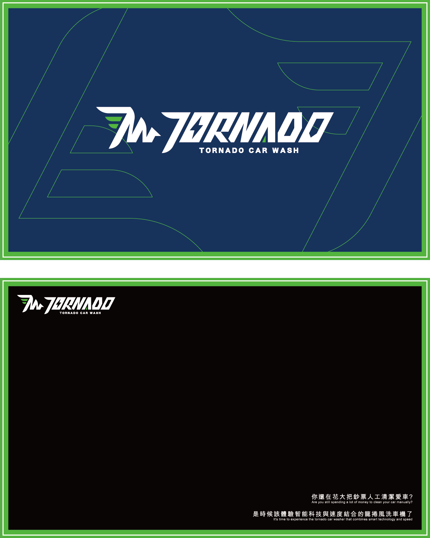 這款名片設計以極簡科技黑為基底,營造專業且穩重的品牌形象,同時突顯洗車服務的高端科技感。綠色線條與標誌細節增添動感與細緻。右側的幾何線條設計成風翼,強調 Tornado(龍捲風)品牌名的速度與動力感,視覺上帶來極強的未來感與速度。