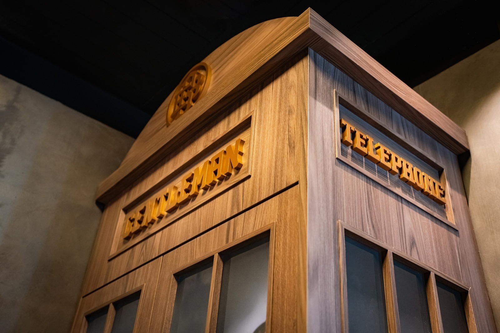 靈感來自於經典的英國紅色電話亭,在金特曼改以低調奢華的深色橡木與古銅金烤漆字呈現,搭配玻璃窗格設計,使櫃檯既具備辨識度,又與整體裝潢風格契合。