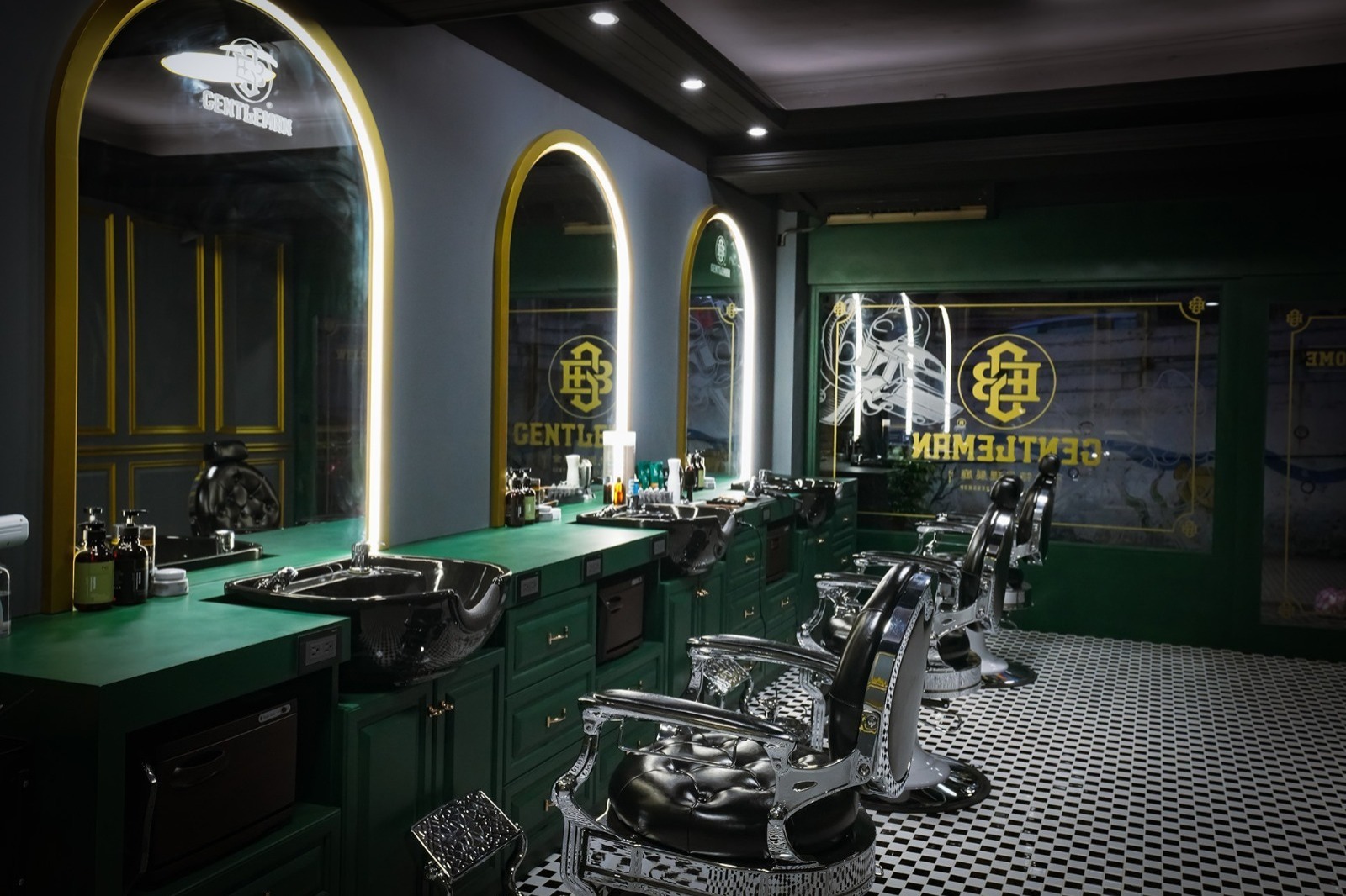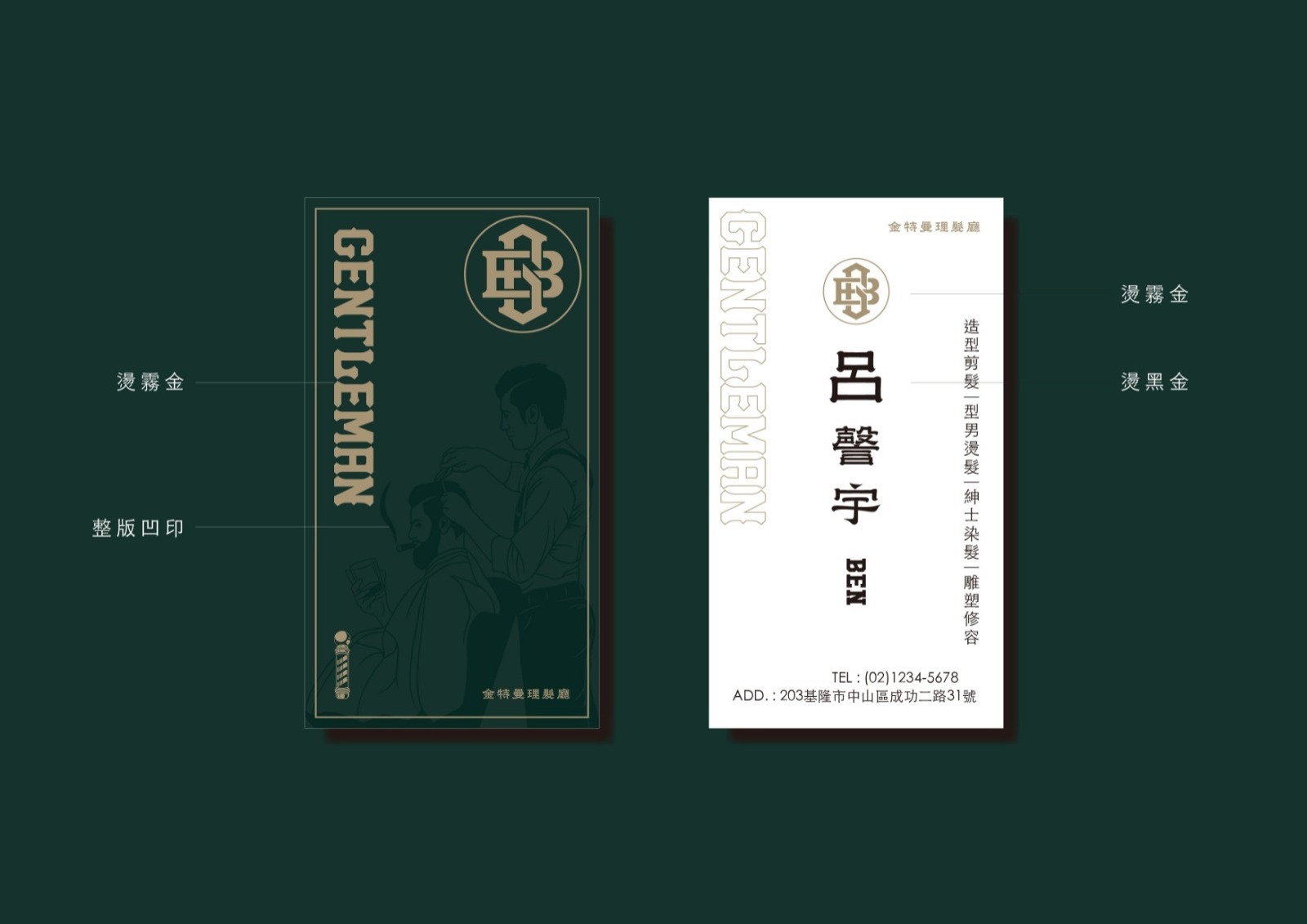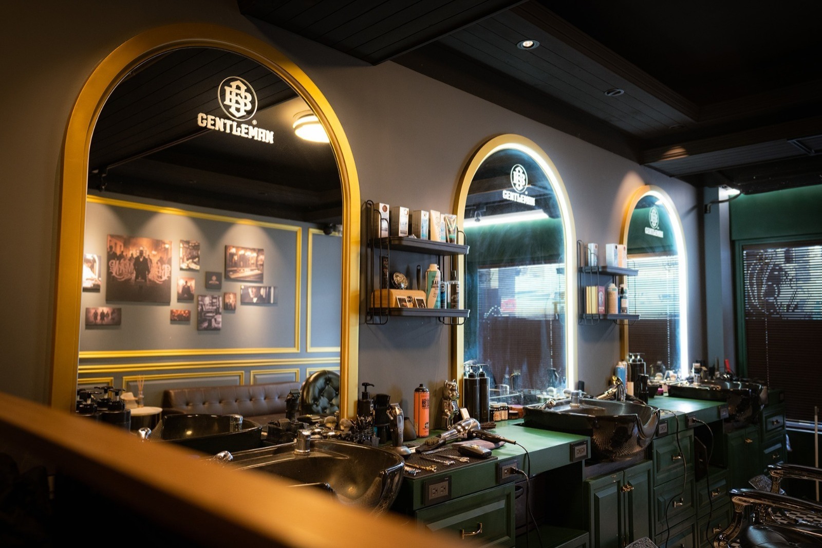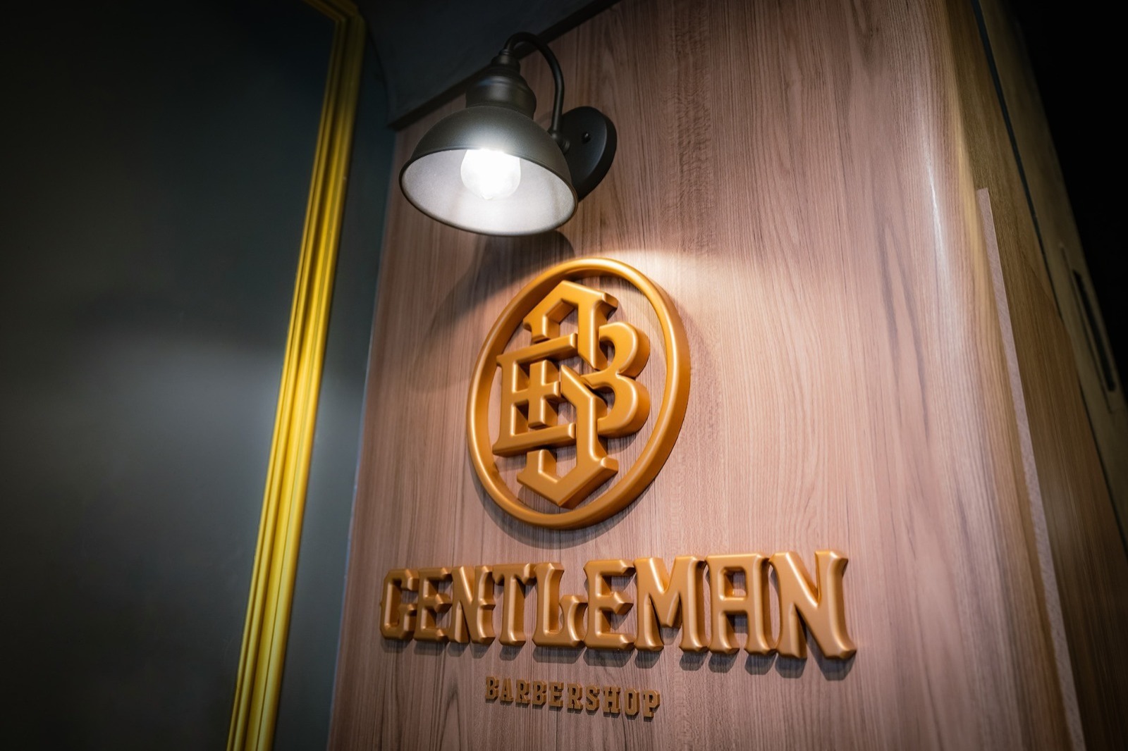 金特曼理髮廳店內的LOGO與標語以古銅金色立體烤漆字設計,安裝於接待區、鏡前牆與其他顯眼位置。這種金屬烤漆在燈光下展現高級質感,與深綠色背景以及深色橡木紋形成強烈對比,增強品牌識別度。
