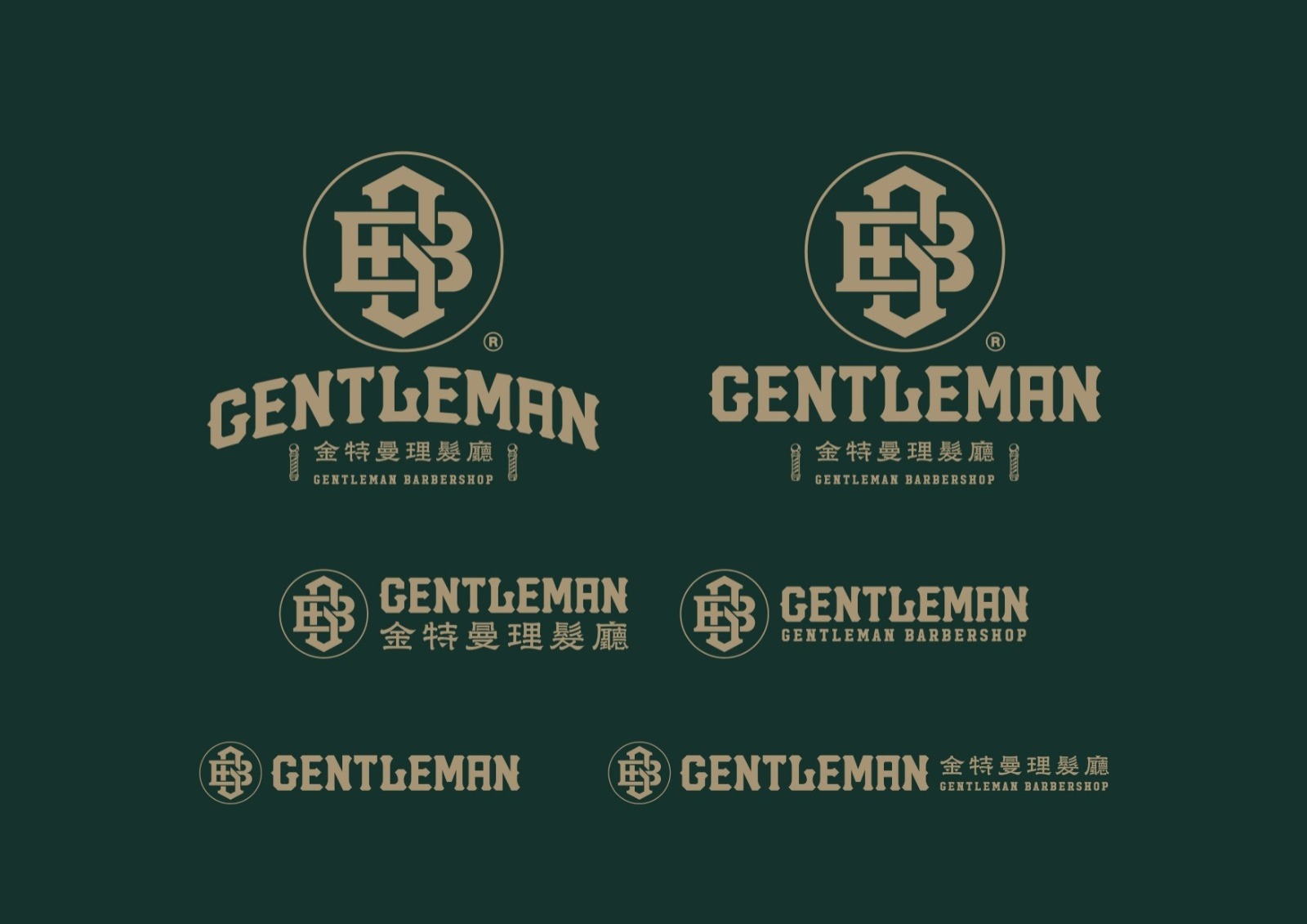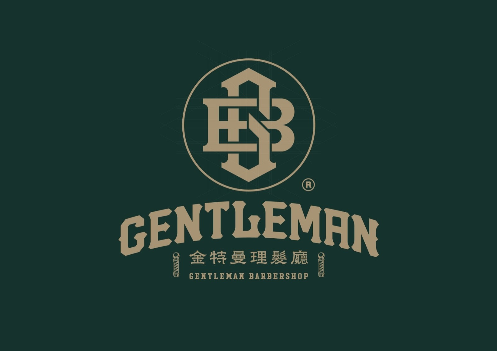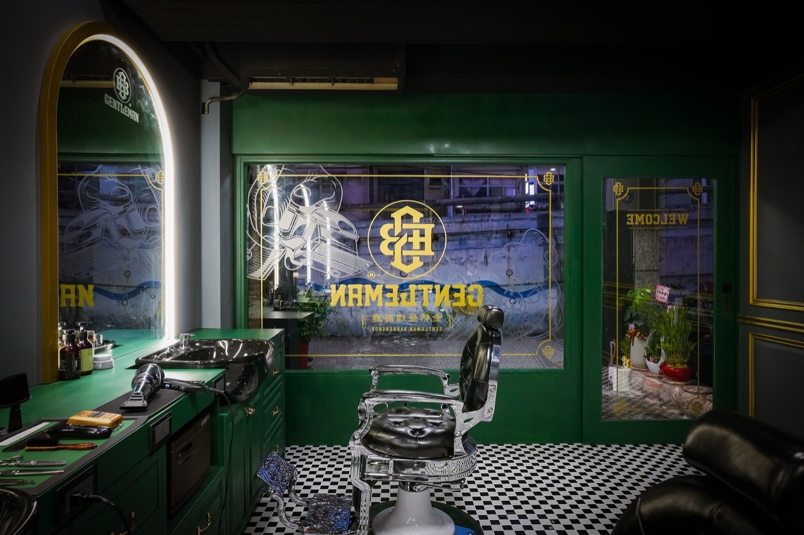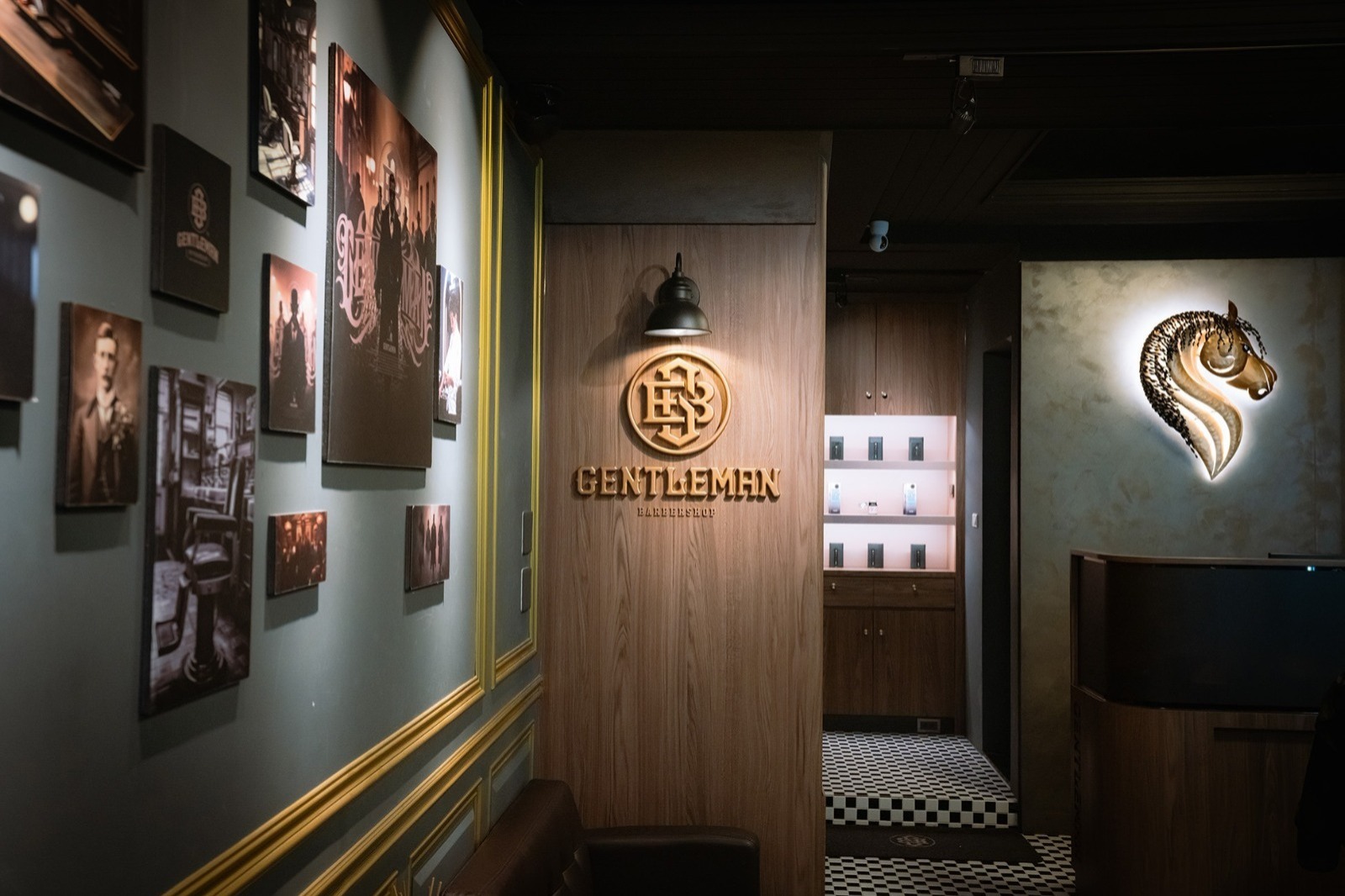 金特曼理髮廳店內的LOGO與標語以古銅金色立體烤漆字設計,安裝於接待區、鏡前牆與其他顯眼位置。這種金屬烤漆在燈光下展現高級質感,與深綠色背景以及深色橡木紋形成強烈對比,增強品牌識別度。