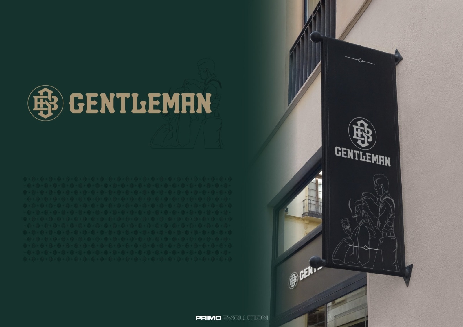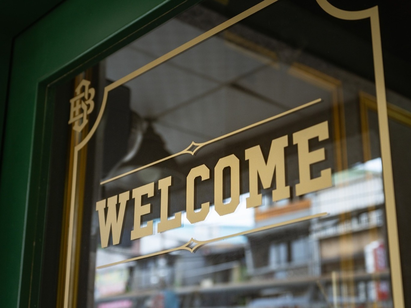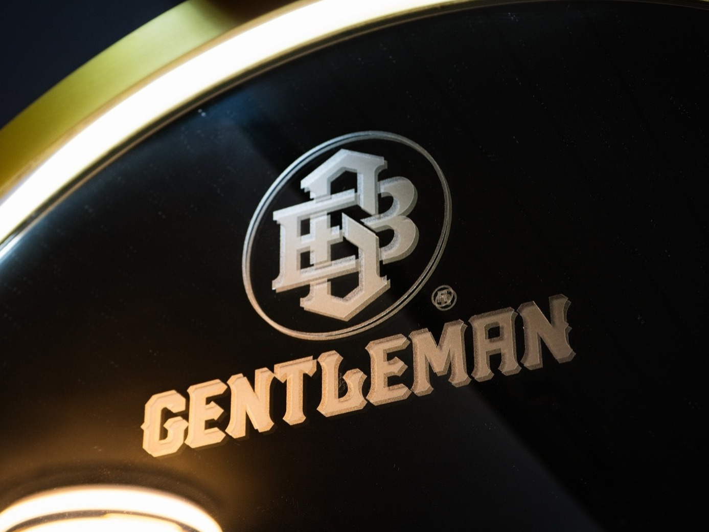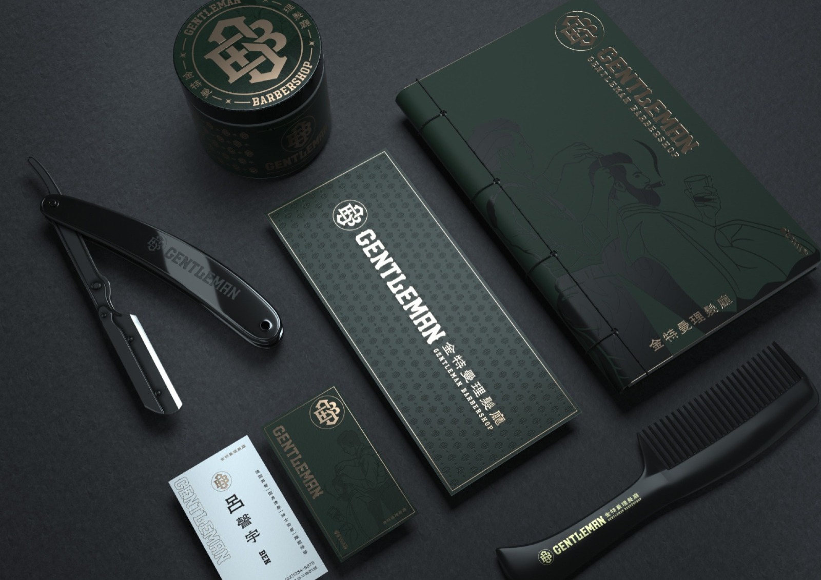 金特曼理髮廳店內的LOGO與標語以古銅金色立體烤漆字設計,安裝於接待區、鏡前牆與其他顯眼位置。這種金屬烤漆在燈光下展現高級質感,與深綠色背景以及深色橡木紋形成強烈對比,增強品牌識別度。