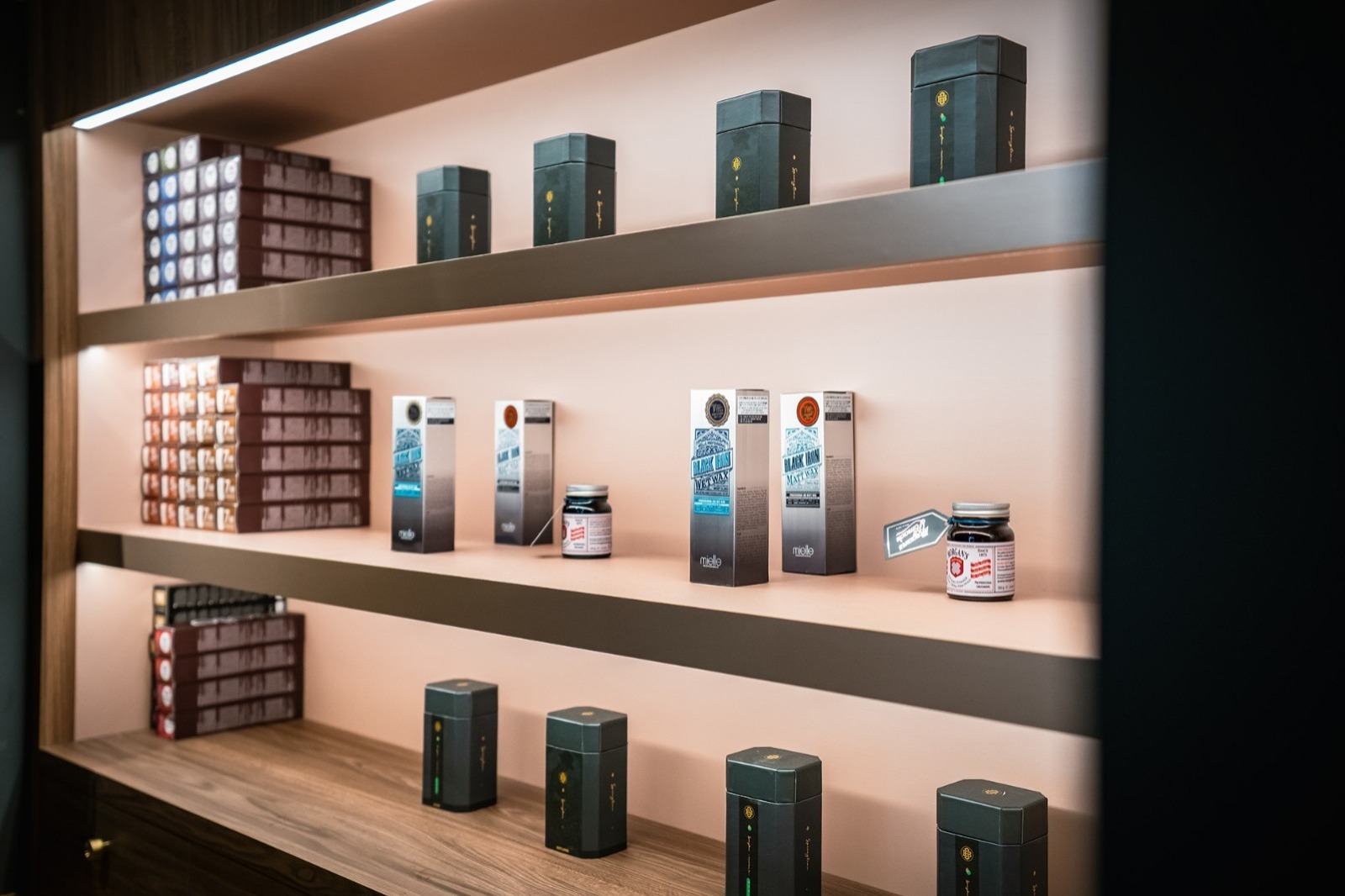 櫃體設計以復古木紋層架為主,選用了深色橡木,搭配古銅金色五金配件,展現沉穩典雅的風格。層架上陳列高級髮品、鬍鬚修剪用品與其他商品,強調紳士格調。